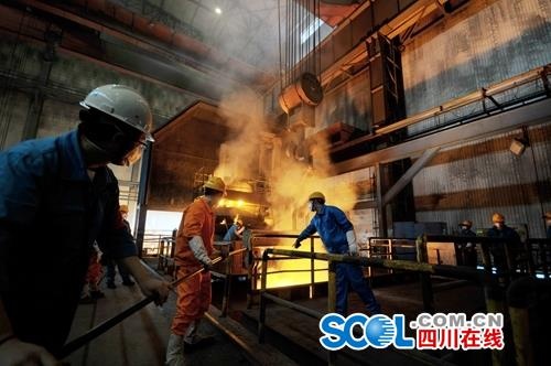 東汽鑄造事業(yè)部鑄鋼車間內(nèi)正在冶煉鋼水。 徐涌 攝