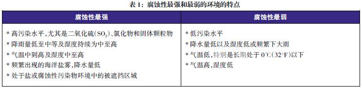 在選用金屬材料時(shí),必須考慮大氣污染物、風(fēng)攜帶的海水鹽份、除冰鹽、溫度、濕度和降水量等因素。相距不過幾公里的不同地點(diǎn),可能由于局部污染和風(fēng)向等原因而具有不同程度的腐蝕性。