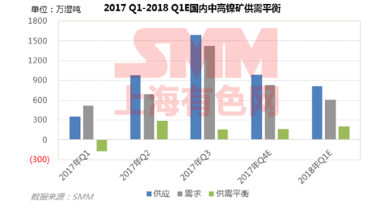 2017年4季度國內(nèi)中高鎳礦維持供應(yīng)過剩,而2018年1季度情況加劇,供應(yīng)過剩209萬濕噸,SMM預(yù)計鎳礦價格仍弱勢。