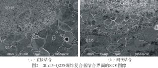 利用掃描電子顯微鏡對爆炸不銹鋼復(fù)合板的結(jié)合界面進行了觀察,發(fā)現(xiàn)不銹鋼與碳鋼之間存在兩種結(jié)合方式,一種是直接結(jié)合(如圖2a所示), 另一種是間接結(jié)合(如圖2b所示)。間接結(jié)合方式中的中間層是由于基板和復(fù)板中的合金元素互溶形成的,該區(qū)域的化學(xué)成分介于復(fù)板和基板之間[5]。因為經(jīng)歷了金屬熔化和凝固階段,熔合層易出現(xiàn)氣孔、裂紋等缺陷,成為界面結(jié)合較薄弱的區(qū)域。從圖2中還可以發(fā)現(xiàn),不管是以何種方式結(jié)合,界面附近都有超細晶粒帶出現(xiàn)。這是在爆炸過程中由于材料的高速碰撞,在極短的時間內(nèi)產(chǎn)生巨大的壓力使該處金屬受到很大的剪切作用,塑性剪切功轉(zhuǎn)變的巨大熱量使金屬在很窄的區(qū)域內(nèi)發(fā)生熔化,之后又急劇冷卻,故形成極細的組織,甚至有非晶組織形成[6]。