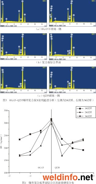 通過掃描電鏡自帶的X射線能譜儀對2#、3# 試樣的基層金屬,結(jié)合界面以及復(fù)層金屬三個區(qū)域進行了分析,結(jié)果如圖3所示,每個區(qū)域各主要元素的含量列于表3、表4之中。由試驗數(shù)據(jù)可得,隨著熱處理時間的增加,界面兩側(cè)元素的相互擴散進行得更加充分,Q235中的Cr含量和0Cr13中的Mn、C含量顯著上升[7]。在不銹鋼一側(cè),長時間的熱處理有助于碳化物的分解,使Cr元素重新固溶到母材之中,消除了貧鉻現(xiàn)象對材料耐腐蝕性能的影響。同時,結(jié)合界面處由于熱處理時間的增加導(dǎo)致碳化鉻數(shù)量的增加, 脆硬的碳化鉻提高了界面處的強度、硬度,但對其塑性、韌性有不利的影響。